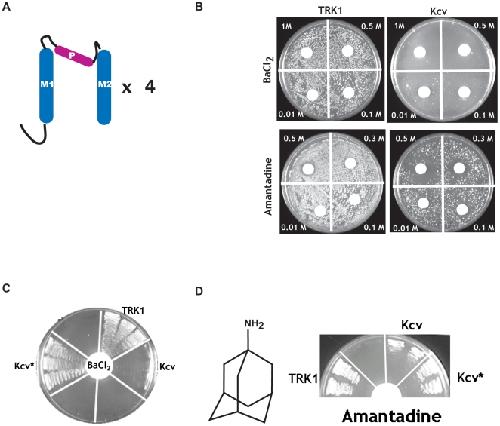 Figure 1. Blockers affect Kcv-dependent rescue of potassium transport deficient yeast.A, Cartoon showing the Kcv topology. The two transmembrane segments (M1 and M2) and the pore-forming region (P) are indicated. Four monomers assemble to make a functional channel. B, Examples of the effects of blockers applied at the indicated concentrations to yeast grown on selective media containing 0.5 mM KCl. Yeast express the transporter TRK1 and Kcv, as indicated. TRK1 image for barium is identical to [9]. C, Barium-resistant rescue of growth by the mutant Kcv* on 0.5 mM KCl media in the presence of 10 mM BaCl2. D, Amantadine-resistant rescue of growth by the mutant Kcv* on 0.5 mM KCl media in the presence of 500 mM amantadine. Chemical structure of amantadine is shown (left). |