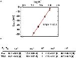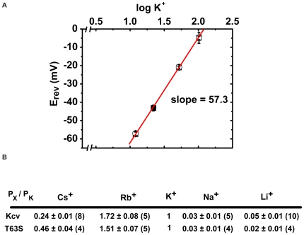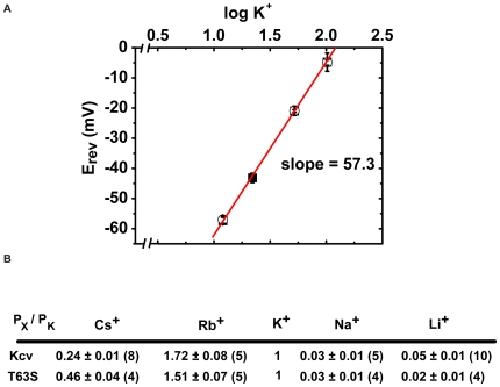Figure 4. Selectivity to K+ and relative permeability to monovalent cations of Kcv and T63S.A, Potassium selectivity of Kcv and Kcv T63S channels. Mean values±s.e. (n = 3) for the current reversal potentials (Erev) of Kcv (○) and T63S (•)obtained in 10, 20, 50 and 100 mM external K+ are plotted as a function of log K+ concentration ([K+]out). Line represents the theoretical Nernst equation EK = RT/zF ln [K+]out/[K+]in with a slope of 59.2 mV, assuming that in oocytes [K+]in = 108.6 mM [64]. B, Permeability of wt Kcv and T63S mutant to different univalent cations. All cations were tested at 50 mM as chloride salts. PX/P K+ is the permeability of the ion X+ relative to K+, calculated from current reversal potentials (see Material and Methods). Values are the means±s.e.; number of tested oocytes is indicated in brackets. Values for wt Kcv are from [65]. |