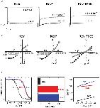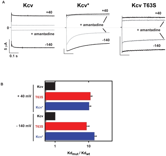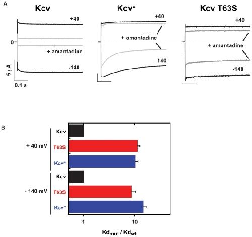 Figure 5. Functional characterization of amantadine sensitivity.A, Current traces at +40 mV and −140 mV in the absence (black) and presence (grey) of 10 mM amantadine for Kcv, Kcv*, and Kcv T63S. B, Comparison of the relative amantadine dissociation constants at +40 mV (2±0.2, wt; 22.4±1.4 Kcv*, 20.5±1.7 T63S) and −140 mV (0.8±0.1, wt; 6.9±0.9 Kcv*, 11.8±0.7 T63S). Errors are s.d. |