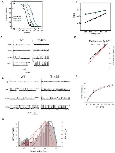 Figure 7. Kir2.1 T142S functional analysis.A, Comparison of the barium Kds for Kir2.1, Kir2.1 T142S (green), and Kir2.1 T141K (blue, data from [9]) B, Woodhull comparison for Kir2.1 and Kir2.1 T142S (green). Lines show fits to the Woodhull equation [63]. Kd(V) = Kd(0)exp(zFδ/RT x V). Kd(0) values are: 131±3 µM and 172±22 µM; δ = 0.56±0.02 and 0.22±0.02 for Kir2.1 and Kir2.1 T142S, respectively. C, Representative current traces of Kir2.1 and Kir2.1 T142S in 90 mM KCl. D, Plot of single channel amplitudes versus membrane potential. E, Single channel current traces for Kir2.1 and Kir2.1 T142S as a function of potassium concentration. F, Single channel conductance as a function of [K+]. Fits are to the Michelis-Menten equation and yielded values of Km = 123 mM, 120 mM, and γmax = 48.5 pS and 51.3 pS for Kir2.1 and Kir2.1-T142S, respectively. G, Gating kinetics analysis of Kir2.1 (black) and Kir2.1-T142s (red). Mean open times Kir2.1 298.7±292.2 ms (n = 416) and Kir2.1-T142S 93.4±92.6 ms (n = 1890). Intraburst probability was not changed (0.84±0.041 n = 8, 0.88±0.042 n = 8, Kir2.1 and Kir2.1-T142S, respectively). Errors are s.d. |