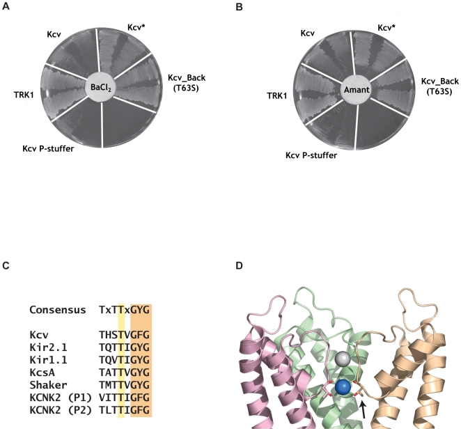 Figure 2. Kcv Blocker-resistant mutants of potassium transport deficient yeast.Rescue in the presence of barium (10 mM BaCl2) A, and amantadine (500 mM) B, by the Kcv* and Kcv_Back mutant identified by backcrossing. Kcv_Back contains a single point mutation, T63S. Kcv P-Stuffer is a non-functional Kcv construct (see Materials and Methods). C, Sequence alignment of the selectivity filter regions of Kcv, Kir2.1, and select potassium channels. The positions of Kcv T63 and Kir2.1 T142 are highlighted in yellow. The selectivity filter ‘GYG’ sequence is also highlighted. D, Model indicating the position of the conserved T63 position (shown in sticks and having one of the copies indicated by the arrow) using KcsA [31]. The site 4 ion, which is coordinated by both backbone and sidechain oxygens from the T63 position is shown as a blue sphere. The front subunit of the KcsA tetramer is not shown. |