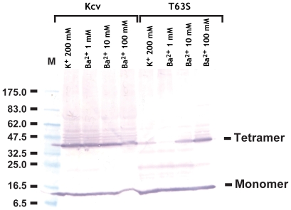 Figure 6. Stability analysis of Kcv and Kcv T63S.Western blot of microsomal membranes containing Kcv or Kcv T63S following treatment with the indicated concentrations of K+ or Ba2+ prior to loading onto an SDS gel. Positions of the tetramer and monomer forms, and the size of the molecular weight markers are indicated. Additional band in T63S is assigned as the dimer. Channels bear an N-terminal His9 tag and were detected using an anti-polyhistidine antibody (see Material and Methods). |