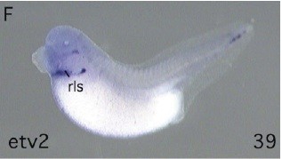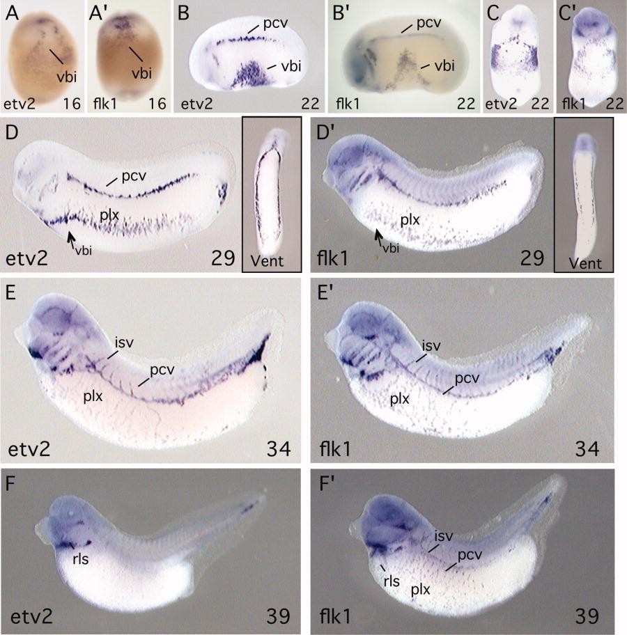 Figure 2. etv2 is expressed in hematopoietic and endothelial precursor cells in the Xenopus embryo. A-F prime : Transcripts of etv2 (A-F) and flk1 (A prime -F prime ) were detected by in situ hybridization. flk1 is an established marker of the hematopoietic and endothelial lineages. Developmental stage of the embryos is indicated at the lower right of each panel. Embryos shown in A,A prime ,C,C prime , and insets in D,D prime are ventral views. All other views are lateral with anterior to the left. vbi, ventral blood island; pcv, posterior cardinal vein; plx, vascular plexus; isv, intersegmental vessel; rls, rostral lymphatic sac. |