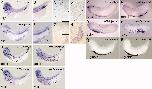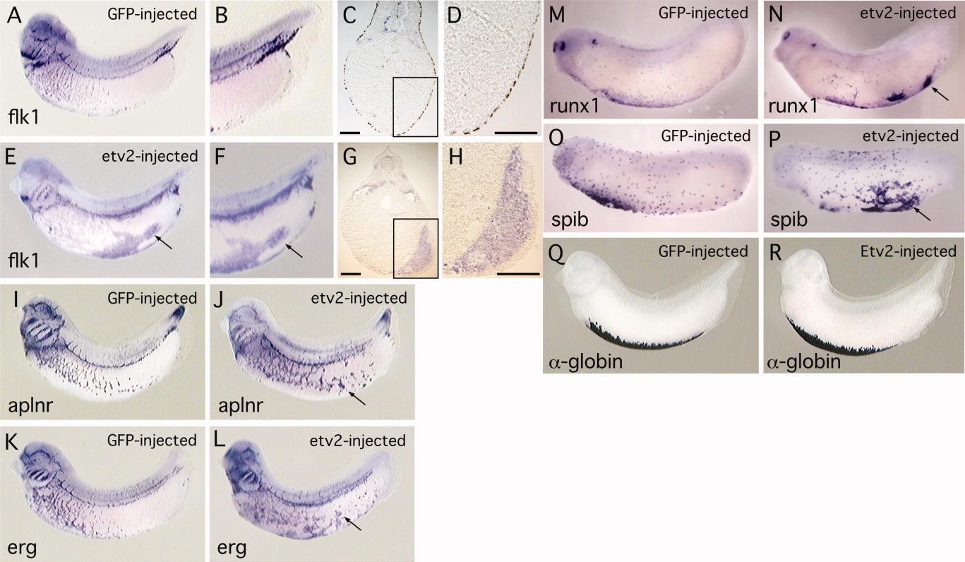 Figure 3. Forced expression of ETV2 in the Xenopus embryos results in ectopic expression of endothelial and myeloid marker genes. A-D: Control embryo, injected with enhanced green fluorescent protein (EGFP) mRNA and assayed for flk1 transcripts. A,B: View of whole embryo (A), and enlarged view (B) of ventral posterior region of embryo showing near absence of endothelial (flk1-expressing) cells. C,D: Transverse section through embryo (C) and enlarged view (D), showing absence of flk1 marker expression in posterior of embryo. E-H: Embryo injected with etv2 mRNA and assayed for flk1 expression. E,F: View of whole embryo (E) and enlarged view (F), showing high levels of ectopic flk1 transcript. G,H: Transverse section through embryo (G) and enlarged view (H), showing large domains of ectopic flk1 transcripts. Scale bar in both G and H = 100 microns. I,J: Control embryo, and embryo injected with etv2 mRNA, assayed for aplnr expression. I: View of embryo injected with EGFP mRNA. J: View of embryo expressing ETV2 and showing ectopic aplnr transcripts. K,L: Control embryo (K) and embryo injected with etv2 mRNA (L), assayed for erg expression. K: View of embryo injected with EGFP mRNA. L: View of embryo expressing ETV2 and showing ectopic erg transcripts. For etv2 mRNA-injected embryos shown in E,J,L, in addition to ectopic marker expression, note the disruption of the normal patterning of endothelial structures, relative to controls. M,N: Control embryo (M) and embryo injected with etv2 mRNA (N), assayed for runx1 expression. M: View of embryo injected with EGFP mRNA. N: View of embryo expressing ETV2 and showing ectopic expression of runx1. In N, in addition to ectopic expression, note reduced expression and altered distribution of endogenous runx1. O,P: Control embryo (O) and embryo injected with etv2 mRNA (P), assayed for spib expression. O: View of embryo injected with EGFP mRNA. P: View of embryo expressing ETV2 and showing ectopic expression of spib. Q,R: Control embryo and embryo injected with etv2 mRNA, assayed for alpha -globin expression. Q: Control embryo injected with EGFP mRNA. R: Whole embryo expressing ETV2, showing no appreciable difference in expression of alpha -globin transcripts. In all panels, arrows indicate regions of ectopic marker expression. |