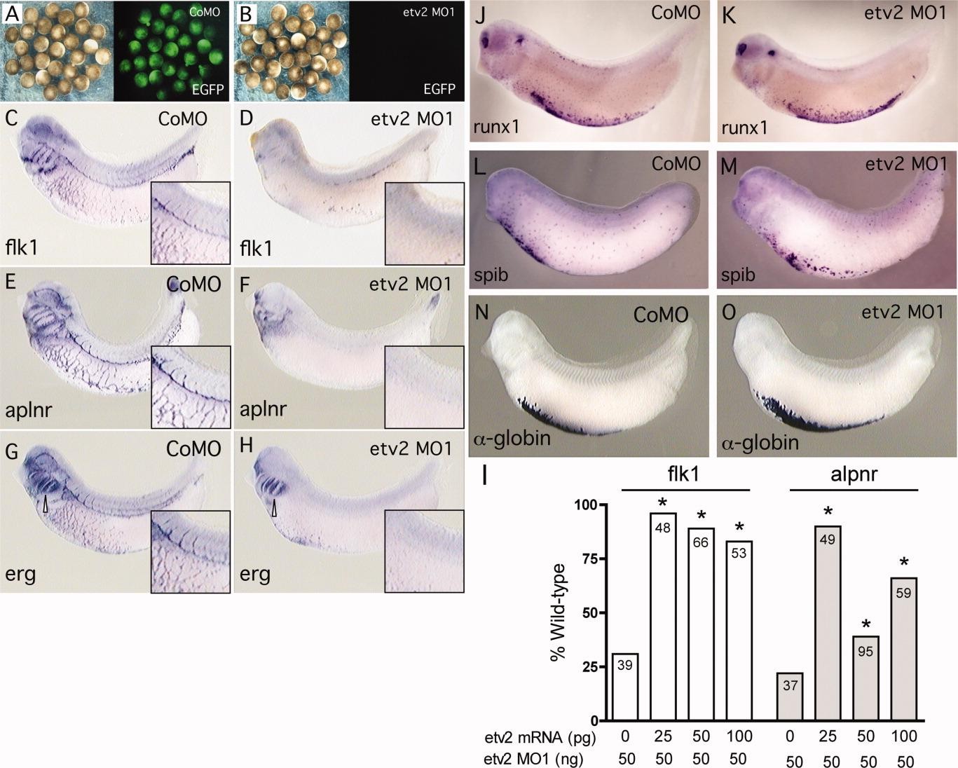 Figure 5. Inhibition of ETV2 function strongly reduces endothelial, but not hematopoietic marker expression. A,B: Antisense etv2 morpholino oligomer 1 (MO1) efficiently inhibits enhanced green fluorescent protein (EGFP) expression from a target transcript in control experiments. A: Brightfield and fluorescent image of embryos injected with etv2-EGFP fusion transcript and etv2 mismatch control MO (CoMO), showing strong EGFP fluorescence. B: Brightfield and fluorescent image of embryos injected with etv2-EGFP fusion transcript and etv2 MO1. EGFP fluorescence is almost eliminated. C-M: Embryos injected with control MO (CoMo) or etv2 MO1 and assayed for marker gene expression (as indicated) by in situ hybridization. All embryos were assayed at approximately stage 32. Inset boxes in panels C-H, show slightly enlarged and/or increased contrast views centered on the intersegmental vessels and posterior cardinal vein. C-H: Treatment with etv2 MO1 effectively eliminated expression of the endothelial marker genes flk1, aplnr, and erg. In H, expression of erg in neural crest cells in the branchial arch region (open arrowhead) is unchanged. I: etv2 MO1 knockdown of endothelial marker expression is efficiently rescued with etv2 mRNA. All embryos were injected with 50 ng of MO1 plus varying amounts of etv2 mRNA as indicated. Marker gene expression was assayed by in situ hybridization and embryos showing mostly normal endothelial pattern were scored as wild-type. The number in each bar indicates the number of embryos scored for each treatment. Asterisks show statistically significant differences relative to value of MO1 alone, analyzed using Chi-squared test. J-O: Treatment with etv2 MO1 had no detectable effect on expression of myeloid (runx1 and spib) or erythroid (tadpole alpha -globin) markers. |