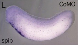 spib (Spi-B transcription factor (Spi-1/PU.1 related)) gene expression in Xenopus laevis embryo, assayed via in situ hybridization, NF stage 28, lateral view, anterior left, dorsal up. |
