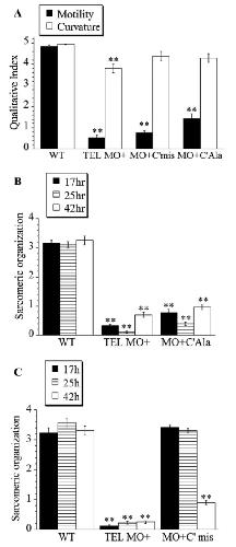decrease in motility in TEL MO�, MO�C�Ala, and MO�C�mis embryos compared to WT