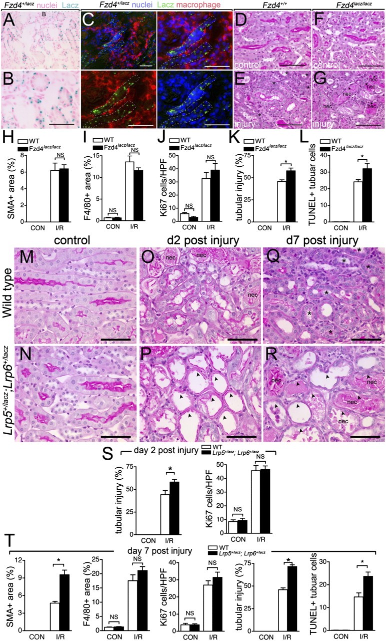 Fig. 3. Mutation of Frizzled4 or coreceptors Lrp5 and Lrp6 prevents normal repair and regeneration of the kidney following ischemia reperfusion injury. (A and B) Lacz staining in d5 post-IRI kidney showing restriction of Fzd4 expression to epithelial tubules and (C) low- (top left) and high-power views (split color panels) showing Fzd4 receptor expression is not present in F4/80+ macrophages in postinjury kidneys. (DâG) PAS-stained sections of normal (D and F) and d5 post-IRI kidneys (E and G) showing persistence of epithelial injury in mice lacking Fzd4 (Fzd4LacZ/LacZ). (HâL) Quantification of inflammation, injury, and repair parameters 5d post-kidney-IRI injury in Fzd4LacZ/LacZ or littermate control mice. (MâR) PAS-stained sections of kidneys. (S and T) Quantification of inflammation, injury, and repair parameters in WT or Lrp5+/lacz; Lrp6+/lacz kidneys. P < 0.05. n = 5 or 6/group. (Scale bars, 50 μm.) Asterisks, regenerating tubules; arrowheads, injured flattened epithelia; nec, necrotic debris.