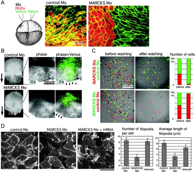 Figure 2. MARCKS is essential for controlling cell polarity, motility, and adhesion. (A) 5 pmol of MARCKS Mo, Rhodamine dextran, and the mRNA for 100 pg of mb-Venus were coinjected into one of the two dorsal blastomeres at the four-cell stage. mb-Venus mRNA alone was injected into the other dorsal blastomere. DMZ explants were cultured on a cover glass coated with FN, and convergent extension movements were observed. (B) Control or 5 pmol of MARCKS Mo was coinjected with 100 pg of Venus mRNA into two blastomeres of four-cell embryos. DMZ explants were cultured on an FN-coated dish until sibling embryos reached the late neurula stage. Arrows indicate the direction of mesendoderm migration. Arrowheads indicate the leading edge. (C) MARCKS Mo inhibited the adhesion on FN. MARCKS Mo, control Mo, Venus mRNAs (green), and Rhodamine dextran (red) were coinjected dorsally as indicated. Cells were dissociated from the DMZ explants. Cells from the control- and MARCKS-Mo–injected explants were mixed, plated on FN-coated dishes, incubated for 6 h, and fixed in formaldehyde. Cells that did not adhere to the dish were removed by washing five times with PBS. (D) 3 pmol of MARCKS Mo inhibited the protrusive activity of cells in DMZ explants. MARCKS Mo or control Mo was coinjected dorsally with mb-Venus mRNA. DMZ explants were cultured on an FN-coated dish until sibling embryos reached the early neurula stage. The effect of MARCKS Mo was rescued by 200 pg of MARCKS mRNA. Bar, 50 μm. The graph shows statistical data obtained by analyzing 15 cells for each sample. The error bars represent statistical significance (p < 0.05).