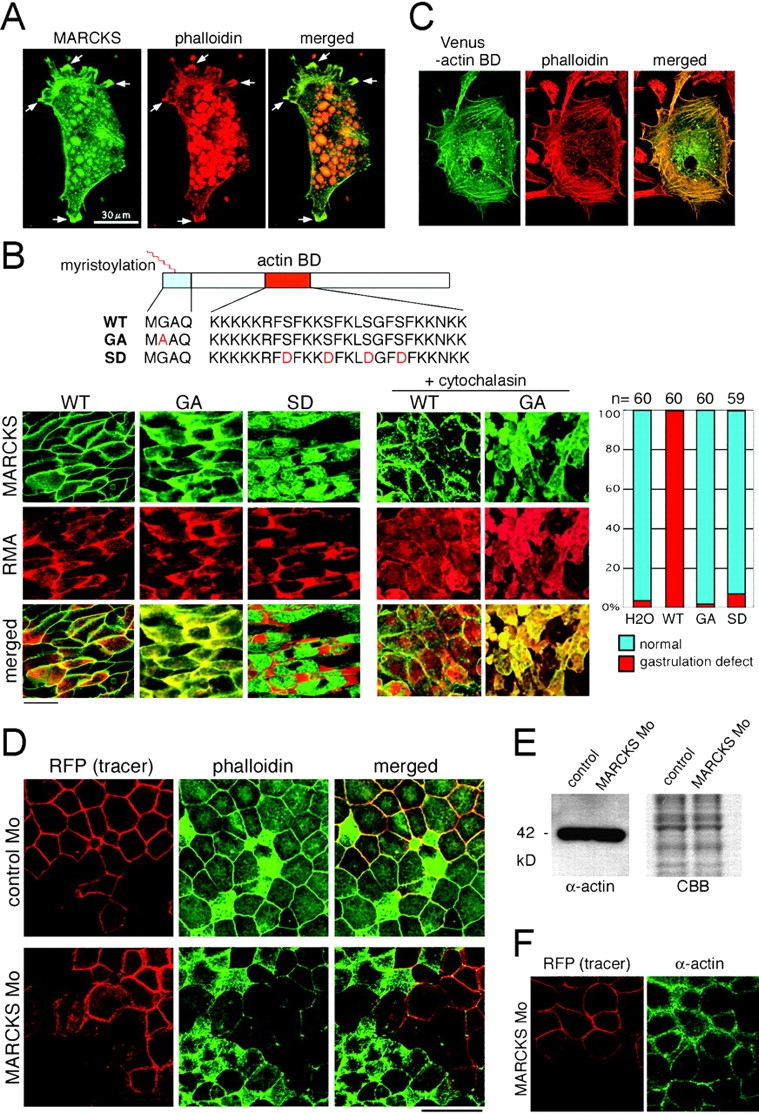 Figure 3. MARCKS regulates cortical actin formation. (A) Cells expressing 200 pg of MARCKS-Venus mRNA were dissociated from DMZ explants and plated on a FN-coated cover glass. Arrows indicate protrusions where both MARCKS and F-actin were enriched. (B) Wild-type, GA, and SD mutants were expressed in the DMZ explants and observed. RMA, RFP fused with the actin-binding domain of moesin. The explants were treated with 200 μM of cytochalasin B for 30 min. Bar, 50 μm. The graph shows percentages of the gastrulation-defective phenotype. (C) The actin-binding domain of Xenopus moesin was fused with Venus (Venus-actin BD) and expressed in CHO cells. (D) Mo was injected into one blastomere of two-cell embryo with mb-RFP mRNA as a tracer. Animal cap explants were fixed and stained with phalloidin. Bar, 50 μm. (E) Western blot with an antiactin antibody (left) and Coomassie Blue (CBB) staining (right). Mo was injected into both of the blastomeres of two-cell embryos. Lysates were prepared from the animal caps. (F) MARCKS Mo and mb-RFP were coinjected and animal cap cells were immunostained with antiactin antibody.