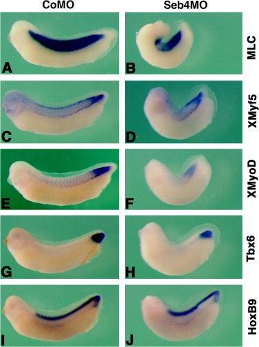 Fig. 4. Knockdown of Seb4 inhibits myogenesis. In situ hybridization using indicated probes was performed on embryos injected with CoMO or Seb4MO and cultured to stage 30. (A) Myosin light chain (MLC) expression in the somitic mesoderm of a CoMO-injected embryo. (B) A Seb4MO-injected embryo with reduced and disorganized somitic mesoderm. (C) XMyf5 expression in a CoMO-injected embryo. (D) Injection of Seb4MO inhibits XMyf5 expression in the anterior and trunk region. (E) XMyoD expression in a CoMO-injected embryo. (F) Injection of Seb4MO inhibits XMyoD expression. (G) Tbx6 expression in the tail-bud of a CoMO-injected embryo. (H) Injection of Seb4MO reduces the expression level of Tbx6 in the tail-bud. (I) HoxB9 expression in the spinal cord of a CoMO-injected embryo. (J) Injection of Seb4MO does not significantly affect HoxB9 expression.