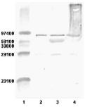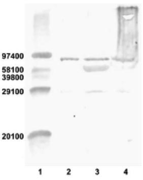 Fig. 5. Western blot analysis of human and Xenopus laevis vitronectin. Lane 1: molecular mass markers. Lane 2: X. laevis liver. Lane 3: X. laevis serum. Lane 4: human serum. These results show that X. laevis vnt is immunologically cross-reactive with anti-human vitronectin antibody.
