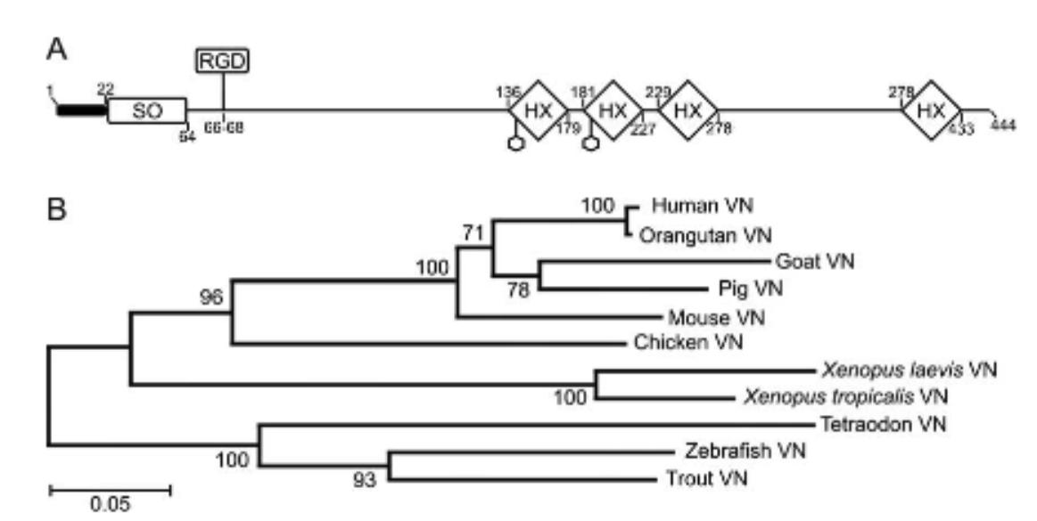 Fig. 1.Xenopus laevis vitronectin structure. (A) Domain structural organization of Xenopus laevis vitronectin. The predicted amino acid sequence of X. laevis vitronectin was analyzed with SMART software. Abbreviations correspond to the conserved somatomedin B (SO) and hemopexin-like (HX) domains. RGD tripeptides are signed. Hexagonalsymbols designate Asn residues that are potential N-glycosylation sites. Numbers indicate the first/last residues. (B) Phylogenetic tree of vitronectin proteins composed from various species: HVN (human vitronectin, AAH05046), OVN (orangutan vitronectin, CAI29588), GVN (goat vitronectin, ABA27428), PVN (pig vitronectin, NP_999269), MVN(mouse vitronectin, AAA40558), CVN (chicken vitronectin, NP_990392), XlVN (African clawed frog vitronectin, ACI29973), XtVN (Xenopus vitronectin, AAH89081), TVN (tetraodon vitronectin, CAG08847), ZVN (zebrafish vitronectin, AAH55570), and TVN (trout vitronectin, CAJ57657). The relationships among the various orthologs were analyzed by the neighbour-joining algorithm within MEGA version 4. Branch points were validated by 1000 bootstrap replications.