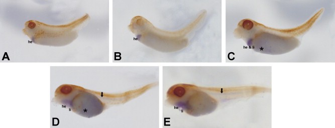 Fig. 4. Whole-mount in situ hybridization analysis of Xenopus vitronectin mRNA expression. Developmental stages (Nieuwkoop and Faber, 1967) shown are (A) stages 37â38, (B) stage 39, (C) stage 40, (D) stage 43 and (E) stage 44. The vitronectin transcripts were first detected at embryonic stages 37â38 in the outline of the heart and gastrointestinal tract. At later stages, the expression in these embryonic regions was increased and at stage 43 it starts to be detected in the notochord. he, heart; li, liver; asterisk, gastrointestinal area; arrows, notochord.