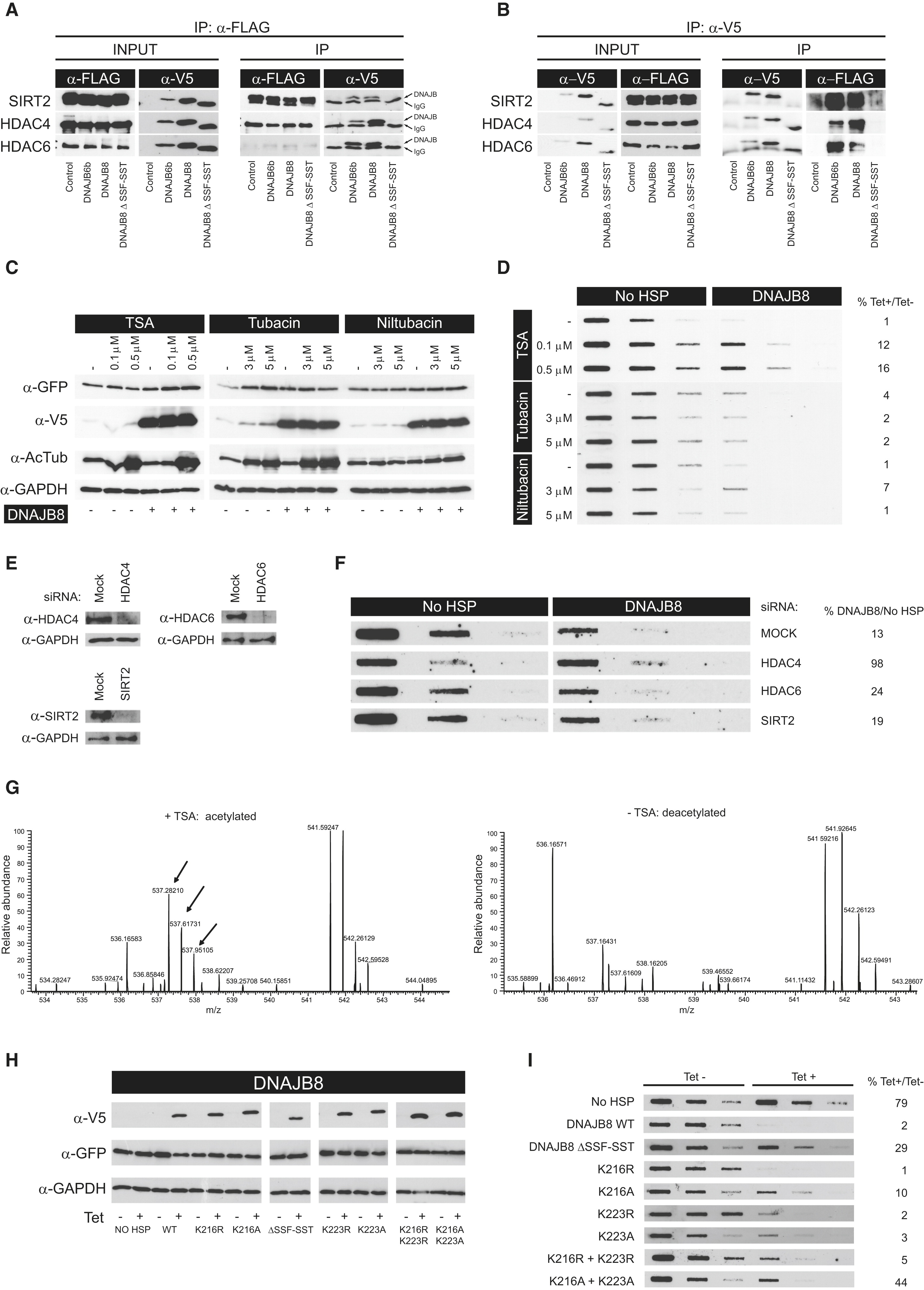 (A) CoIP of HDACs (FLAG-tagged) with V5-tagged DNAJB6b, DNAJB8, or DNAJB8 ΔSSF-SST.