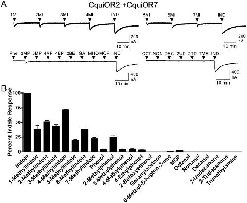 Figure 5. CquiOR2 + CquiOR7 is highly responsive to indole.A) Upper trace, an oocyte expressing CquiOR2 + CquiOR7 is challenged with 20 s applications of a range of concentrations of indole. Middle trace, an oocyte expressing CquiOR2 + CquiOR7 is challenged with 20 s applications of a range of concentrations of 3-methylindole. Lower trace, an oocyte expressing CquiOR2 + CquiOR7 is challenged with 20 s applications of a range of concentrations of 2-methylphenol. B) Concentration-response relationships for CquiOR2 + CquiOR7 expressing oocytes when activated with a range of indole, 3-methylindole and 2-methylphenol concentrations. All data are normalized to the response of each oocyte to 300 nM indole and the curves were fit as described in Materials and Methods (means ± SEM; n = 5–16). EC50 and nH values are provided in Table 1.