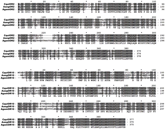Figure 2. Alignment of mosquito OR2 and OR10 amino acid sequences.Dark grey and light grey shading indicate residues conserved among three species and between two of the three species, respectively.