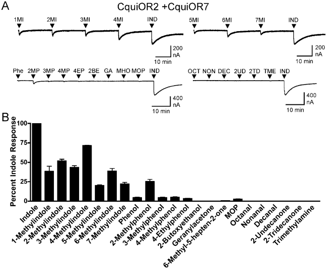 Figure 4. CquiOR2 + CquiOR7 responds to indole, various methylindoles and 2-methylphenol.Xenopus oocytes expressing CquiOR2 + CquiOR7 were challenged with a panel of odorant compounds, each applied for 20 s at 10 µM. A) Upper left trace, an oocyte expressing CquiOR2 + CquiOR7 is challenged with 1-methylindole (1MI), 2-methylindole (2MI), 3-methylindole (3MI), 4-methylindole (4MI) and indole (IND). Upper right trace, an oocyte expressing CquiOR2 + CquiOR7 is challenged with 5-methylindole (5MI), 6-methylindole (6MI), 7-methylindole (7MI) and indole (IND). Lower left trace, an oocyte expressing CquiOR2 + CquiOR7 is challenged with phenol (Phe), 2-methylphenol (2MP), 3-methylphenol (3MP), 4-methylphenol (4MP), 4-ethylphenol (4EP), 2-butoxyethanol (2BE), geranylacetone (GA), 6-methyl-5-hepten-2-one (MHO), mosquito oviposition pheromone (MOP) and indole (IND). Lower right trace, an oocyte expressing CquiOR2 + CquiOR7 is challenged with octanal (OCT), nonanal (NON), decanal (DEC), 2-undecanone (2UD), 2-tridecanone (2TD), trimethylamine (TME) and indole (IND). B) Quantification of current responses of CquiOR2 + CquiOR7 expressing receptors. All responses are normalized to the response of the same oocyte to 10 µM indole (mean ± SEM, n = 3–4).