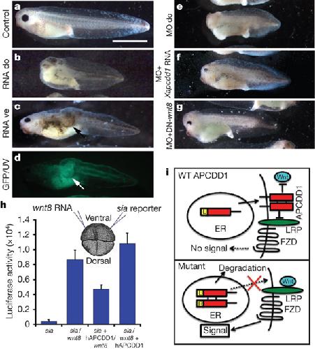 FIGURE 4. APCDD1 inhibits the Wnt pathway in Xenopus embryos. a, b, Dorsal (do) overexpression of human APCDD1 (hAPCDD1) reduces axial and anterior structures (b). Scale bar, 4âmm (a). c, d, Ventral (ve) overexpression of hAPCDD1 produces a secondary axis (arrow in c) in cell autonomous fashion (GFP tracer under ultraviolet (UV) light, arrow in d). eâg, Phenotype of Xapcdd1 protein depletion and its rescue. Dorsal depletion by MO produced a ventralized phenotype (e), which was rescued by Xapcdd1 RNA (f) and by dominant-negative wnt8 RNA (DN-wnt8) (g). h, APCDD1 is required in the signal-receiving cells. wnt8 RNA and siamois reporter gene were injected in adjacent cells. hAPCDD1 inhibited signalling only when co-injected with the reporter. +, Coexpression in the same cell; /, expression in different cells. i, Potential mechanism of action for wild-type and mutant APCDD1. Top, wild-type APCDD1 (L) is processed in the ER and localized at the cell membrane, where it may inhibit Wnt signalling by interacting with Wnt and LRP proteins. Bottom, when wild-type and APCDD1(L9R) (R) are co-expressed, wild-type APCDD1 is retained and degraded in the ER with the mutant, thus activating the Wnt signalling pathway.