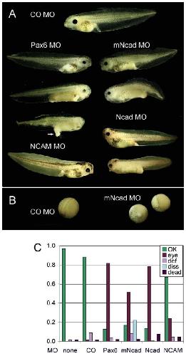 Figure 2 External phenotypes of Pax6, mNcad, Ncad, and NCAM knockdown embryos. A: Representative tadpoles at Stage 45 carrying control morpholino (CO MO) or antisense morpholino against Pax6 (Pax6 MO) or individual Pax6-de- pendent genes coding for the cell adhesion molecules (mNcad MO, Ncad MO, or NCAM MO). Pax6 MO, two small-eyed Pax6-deficient tadpoles and one \eyeless" indi- vidual. Note the delay in differentiation of the intestinal tract, the most severe case presenting prolapse (arrow). mNcad MO, two small-eyed individuals with delayed differentiation of the intestinal tract. Ncad MO, two small-eyed individuals with delayed differentiation including the intestinal tract. NCAM MO, tadpole with slightly decreased eye size and normal differentiation of the body. B: Normal neurula (CO MO) and two arrested gastrulae (mNcad MO) with dissociat- ing cells in one body half, resulting from injection of 15 ng of morpholino directed against mNcad into one cell of the two-cell stage. C: Frequency of external phenotypes, scored at Stage 42. Averages of 3â6 experimental series with >100 injected embryos. Embryos were injected with no (none), control (CO) or with antisense morpholino (MO) against Pax6, mNcad, Ncad, or NCAM. OK, normal embryos; eye, reduced or rudimentary eyes; def, various deformities (microcephaly, axial disturbance, bent tail) considered to be non-specific; diss, entirely dissociated embryos, most often, accompanied by disturbances in the digestive tract; dead, le- thal before Stage 42. [Color figure can be viewed in the online issue, which is available at wileyonlinelibrary.com.] |
