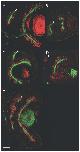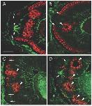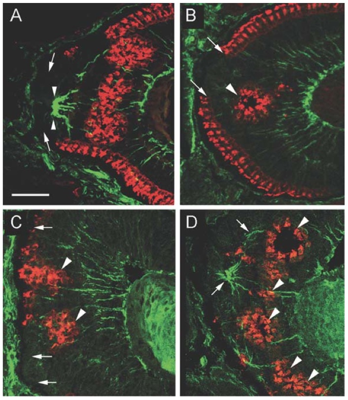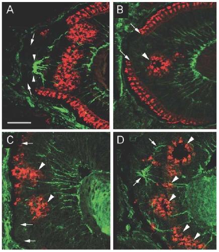 Figure 4 Photoreceptor rosettes in retinas deficient for Pax6 (A), mNcad (B), Ncad (C), and NCAM (D). Cryostat sections and confocal microscopy of Stage 42 tadpoles using antiserum to photoreceptors (red) and monoclonal antibody to vimentin (green) to reveal radial glia. A: Mu Ìller cell endfeet (arrowheads) directed toward the RPE layer (arrows), indicating the presence of a second retina in mir- ror orientation. B: Rosette (arrowhead) and a corresponding gap (arrows) in the photoreceptor layer suggesting displace- ment of outer into inner retina. C: Heavy disruption of photoreceptor layer (arrows) and rosette formation (arrow- heads). D: Numerous rosettes (arrowheads) and Mu Ìller cell endfeet (arrow) in the outer retina. Bar, 50 um. |
