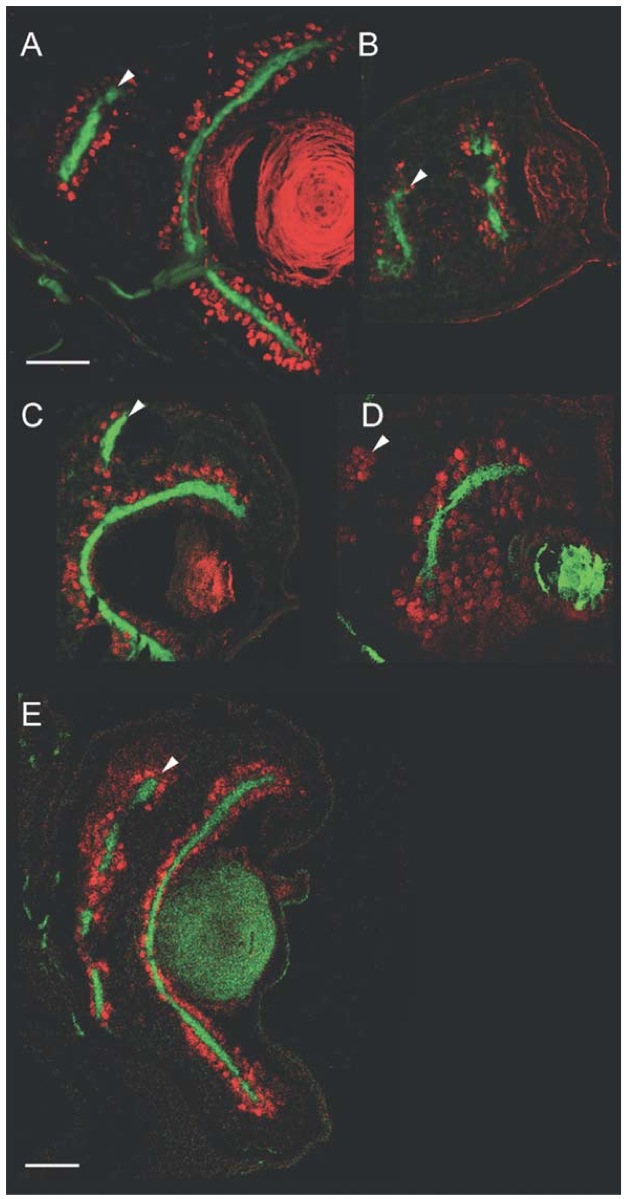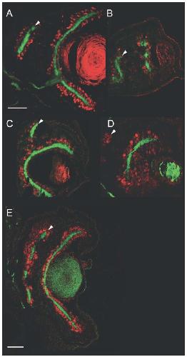 Figure 5 Duplication of inner retinal layers in Pax6 (A,B), mNcad (C), Ncad (D), and (E) tadpoles (Stage 42). Cryostat sections and confocal microscopy using polyclonal antibodies to Pax6 (red) and monoclonal antibody to syn- taxin (green). Duplications are marked by an arrowhead. B: Note duplication in the rudimentary eye, in spite of reduced number of neurons. D: Cluster of Pax6-positive nuclei in outer retina in the absence of a differentiated inner plexiform layer (arrowhead). D,E: Staining of the lens is not specific. Bars, 50 uM (AâD), (E). |