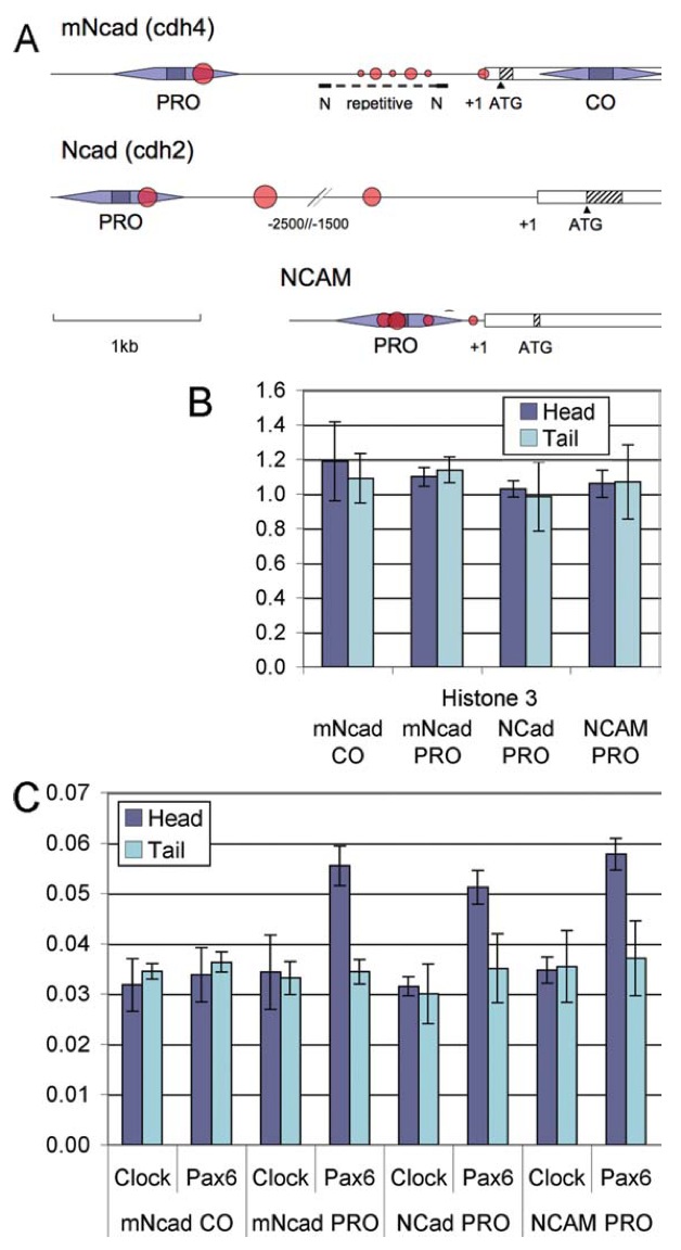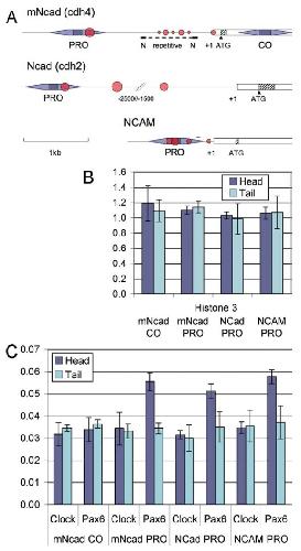 Figure 8 Chromatin immunoprecipitation of Pax6-binding motifs in genes coding for cell adhesion molecules. A: Sketch of promoter regions of the genes coding for mNcad, Ncad, and NCAM. Hypothetical Pax6-binding sites, revealed by computer search, are indicated by circles of varying diameter, reflecting their respective scores. Amplicons (boxes) of pro- moter regions (PRO) or an intragenic region (CO) may origi- nate from DNA fragments extending 250â500 bp (lozenge) on either side. Repetitive elements (stippled line) and so far not sequenced segments (N) preclude analysis of the proximal promoter region of mNcad. B: ChIP analysis of the four gene regions mNcad PRO and CO, Ncad PRO and NCAM PRO, with histone H3 antibodies yields near-equal values in both head and tail chromatin, expressed as percent of the input ma- terial precipitated. Average from two experiments 6 SD. C: ChIP analysis with anti-Clock and anti-Pax6 antibodies on the same gene regions as in B. Note that about twice as many fragments of the promoter regions of the three genes coding for cell adhesion proteins were precipitated from chromatin preparations of heads by Pax6 antibody as compared to the nonspecific anti-Clock antibody. [Color figure can be viewed in the online issue, which is available at wileyonlinelibrary. com.] |