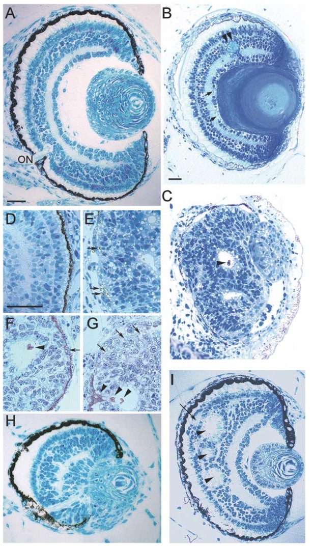 Figure 3 Retinal disturbances in tadpoles deficient for Pax6 (B,C,E), mNcad (F,G,I) or Ncad (H).Representative semithin sections through eyes between Stages 38â48. A: Control Stage 42 with correct retinal lamination. ON, optic nerve. B: Eye of Pax6-deficient Stage 48 tadpole with small photoreceptor rosettes (arrowheads) and reduced number of ganglion cells (arrows). C: Eye of a Pax6-deficient, albino tadpole (Stage 48) displaying distorted eye axis, a poorly differentiated lens, and severely disturbed lamination with rosette formation and a displaced cluster of RPE cells (arrowhead). Note retarded neuronal differentiation. D: RPE-neural retinal interface of a control retina (Stage 40) with correct apposition of photoreceptors onto RPE. E: Age-matched Pax6-deficient retina with a poorly defined interface between RPE and neural retina (arrows). F,G: Dis- turbed interface (arrows) with rosettes and displaced RPE cells (arrowheads) in an mN caddeficient retina (Stage 38). H: Small-eyed phenotype caused by Ncad deficiency (Stage 42). I: Multiple rosettes (arrowheads) and a duplication of inner retina (arrow) in an mNcad-deficient Stage 46 tad- pole. Bars, 50 um (A), (DâG), (B,C,H,I). |