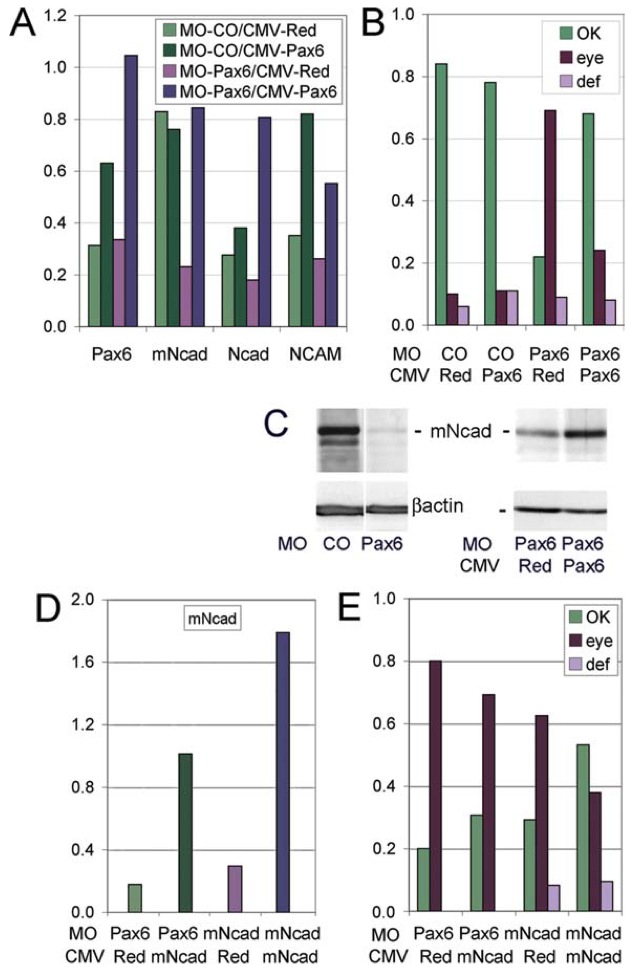 Figure 7 Rescue of target gene expression by Pax6. A: Steady state Pax6, mNcad, Ncad, and NCAM mRNA levels in embryos (Stage 30) carrying either control (MO-CO) or anti-Pax6 morpholino (MO-Pax6), mixed with a CMV- driven expression vector coding for either red fluorescent protein (CMV-Red) or Pax6 (CMV-Pax6). B: Frequency of phenotypes (Stage 36) in sibling embryos (treated as in A). OK, normal; eye, small or defective eye; def, other malfor- mations. C: Western blots for mNcad and bactin in knock- down and rescued embryos (as in A, Stage 30). The smaller reactive band is a degradation product. D: mNcad mRNA levels in embryos (Stage 30) carrying anti-Pax6 (MO-Pax6) or anti-mNcad morpholino (MO-mNcad) and CMV-Red or CMV-mNcad vector. E: Frequency of phenotypes in sibling embryos (Stage 36; treated as in D, phenotypes as in B). [Color figure can be viewed in the online issue, which is available at wileyonlinelibrary.com.] |