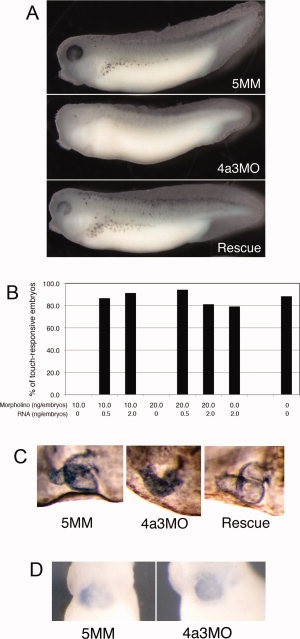 Figure 2. The Eif4a3 morphant phenotype. A: Loss of pigment-forming cells following Eif4a3 knockdown. Twenty-one nanograms of each morpholino (â4a3MOâ: Eif4a3 morpholino; â5MMâ: 5 base pair mismatch Eif4a3 morpholino) was injected, as listed, in this and subsequent figures. âRescueâ: Eif4a3MO+2 ng eif4a3 RNA. Embryos were derived from albino eggs fertilized with sperm from wild-type males. B: Loss of touch-response behavior in Eif4a3 morphants. Graph depicting percentage of touch-responsive embryos injected with listed doses of eif4a3 RNA and/or morpholino (4a3MO), as shown. C: Defects of heart formation in Eif4a3 morphants. Troponin T staining of cardiac tissue in stage-37/38 embryos injected with 4a3MO, 5MM, or 4a3MO+Eif4a3 RNA (Rescue). Note lack of heart looping in 4a3MO-injected embryo. D: Whole-mount in situ hybridization with antisense probes against Xnkx-2.5 in stage-28 embryos injected with Eif4a3MO (4a3MO) or Eif4a3MM (5MM), as listed. No significant differences were seen in the expression of this marker at neurula or tailbud stages (data not shown).