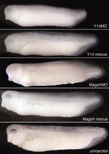 Figure 3. The Y14 and Magoh morphant phenotypes. Loss of pigment-forming cells following Y14 or Magoh knockdown. Y14 morpholino (2.6 ng) (âY14MOâ) or 10 ng of Magoh morpholino (âMagohMOâ) was injected, as listed. âRescueâ: MO+2 ng corresponding RNA. Embryos were derived from albino eggs fertilized with sperm from wild-type males.