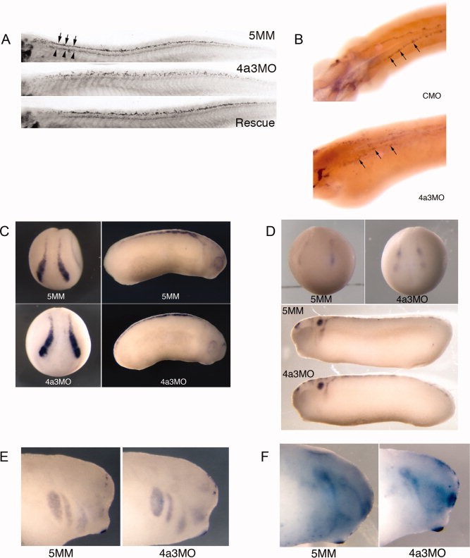 Figure 6. Eif4a3 morphants display late defects in sensory neuron and neural crest development. A: Islet-1 antibody staining of Rohon-Beard (top band of nuclei in top panel, arrows) and motor (bottom band of nuclei in top panel, arrowheads) neurons. Increased dorsoventral spread of Islet-1-positive Rohon-Beard cells, as well as a reduction in intensity of Islet-1 staining in motor neuron nuclei, was observed in Eif4a3 morphants; both defects were partially rescued by co-injection of eif4a3 RNA. B: Whole-mount in situ hybridization with an antisense probe against hox11L2 in embryos injected with Eif4a3MO (4a3MO) or a control (scrambled) morpholino (CMO). Note disorganization of hox11L2-positive Rohon-Beard cells (arrows) in the Eif4a3 morphant embryo. CâF: Whole-mount in situ hybridization with antisense probes against slug/snail2 (C), sox10 (D), Xtwist (E), or Xsix-1 (F) in embryos injected with Eif4a3MO (4a3MO) or Eif4a3MM (5MM) morpholinos, as listed. No consistent differences were seen in the expression of these markers at neurula or tailbud stages.