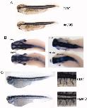 Figure 5. Somite and neuronal development in Eif4a3 morphants. A: 12/101 antibody staining of somitic mesoderm in embryos injected with Eif4a3MO (4a3MO) or a control (scrambled) morpholino (CMO). No differences in somite staining were observed between the two populations. B: Whole-mount in situ hybridization with antisense probes against elrC (left) or sox3 (right) in embryos injected with Eif4a3MO (4a3MO) or Eif4a3MM (5MM). Note slight expansion of anterior neural tube in Eif4a3 morphants. C: Left panels: 3A10 antibody staining of neurons in embryos injected with Eif4a3MO (4a3MO) or a control (scrambled) morpholino (CMO). Right panels: High magnification of trunk detail of embryos at left. Note disorganization of âYâ-shaped motor neuron bundles in Eif4a3 morphants.