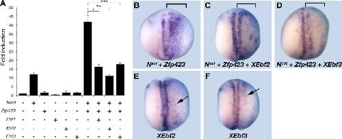 FIGURE 6. EBF TFs reduce ZFP423-NICD-mediated Hes5 gene expression in vitro and in vivo. A, RT-qPCR analysis of Hes5 gene expression in P19 cells transfected with the indicated constructs. Note that Ebf1, Ebf2, or Ebf3 alone does not affect basal Hes5 expression. B, whole mount in situ hybridization analysis of ESR1 gene expression in embryos injected unilaterally (bracket) with Nact (100 pg) and Zfp423 (600 pg) and/or XEbf2 (100 pg) or XEbf3 (100 pg). E and F, whole mount in situ hybridization analysis of ESR1 gene expression in embryos injected unilaterally with XEbf2 (100 pg) or XEbf3 (100 pg), as indicated. Note slightly increased ESR1-positive cells in XEbf2- and XEbf3-injected embryos (arrow). B, LacZ (blue stain) serves as an indicator of the injected side. |