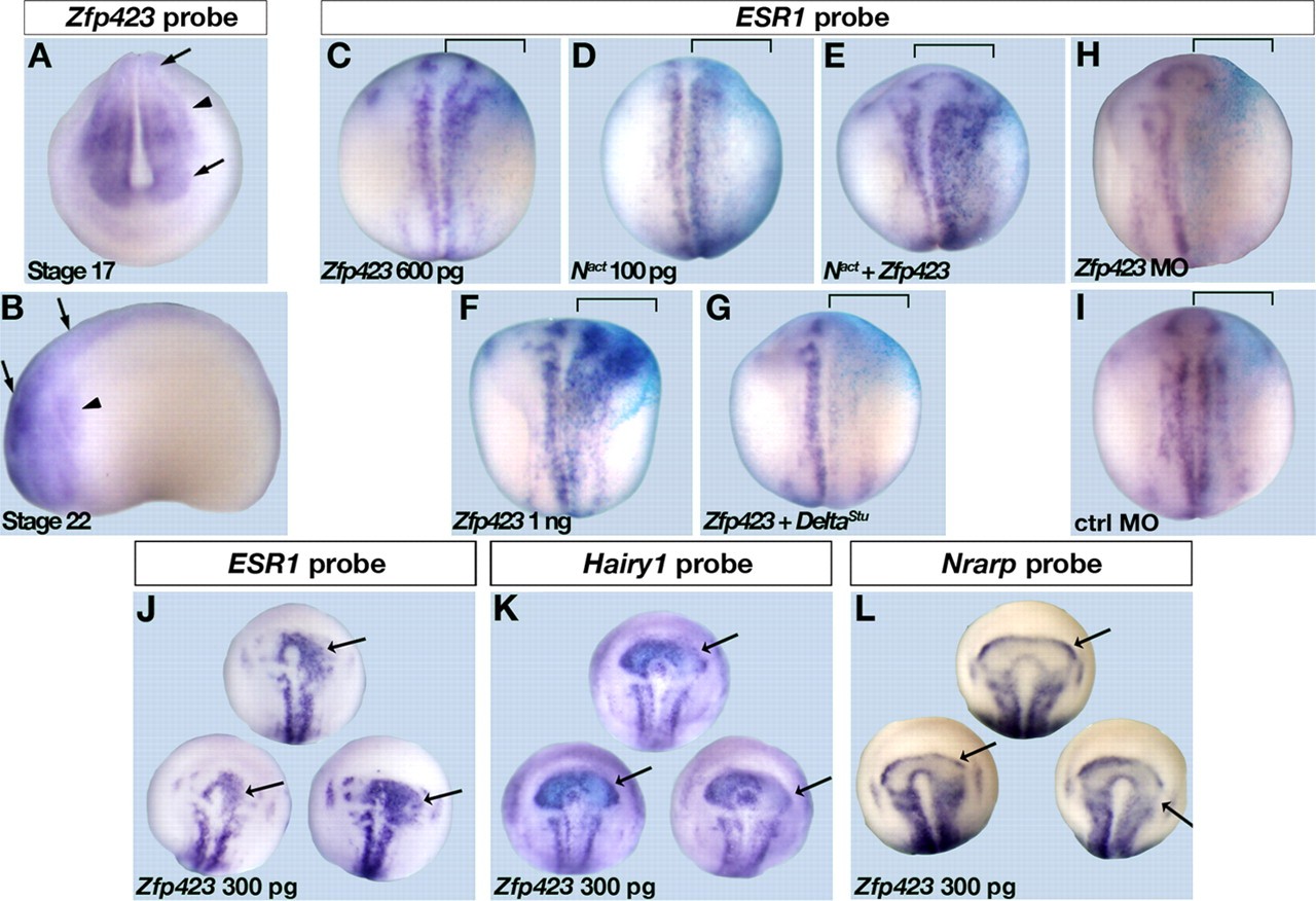 FIGURE 3. Selective, cooperative activation of ESR1 gene expression by Nact and ZFP423 in Xenopus embryos. A and B, whole mount in situ hybridization analysis of Xenopus Zfp423 gene expression in stage 17 (frontal view) and stage 22 (lateral view, head to the left) embryos, respectively: the gene is widely expressed starting in the neural plate/tube first (arrow), and then moving to the cranial neural crest (arrowhead). C, whole mount in situ hybridization analysis of ESR1 gene expression in embryos injected unilaterally (bracket) with Zfp423 (600 pg) and/or Nact (100 pg), as indicated. LacZ (blue stain) serves as an indicator of the injected side. Note strong ESR1 expression after coinjection of Nact and Zfp423. F, embryo injected unilaterally (bracket) with 1 ng of Zfp423. G, embryo injected unilaterally (bracket) with 1 ng of Zfp423 and 400 pg of DeltaStu, encoding a dominant negative Notch ligand. Note disappearance of ESR1 signal on the co-injected side. H and I, unilateral injection (bracket) of a Zfp423 morpholino oligonucleotide (H) and of a control morpholino (I) (see xperimental Procedures. Note disappearance of ESR1 signal on the injected side in embryos injected with Zfp423-specific morpholino unlike those injected with the control morpholino. J, Zfp423 overexpression selectively up-regulates ESR1 but not Hairy1 or Nrarp in Xenopus embryos. Whole mount in situ hybridization analysis of ESR1, Hairy1, and Nrarp gene expression in embryos injected unilaterally with Zfp423 (300 pg, arrow) in a dorsal blastomere. Note expanded ESR1 expression domain (J), but reduced/unaffected expression of Hairy1 (K) and Nrarp (L) on the injected side. Gfp was coinjected with Zfp423 as a lineage tracer (not shown). |