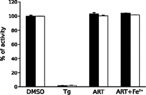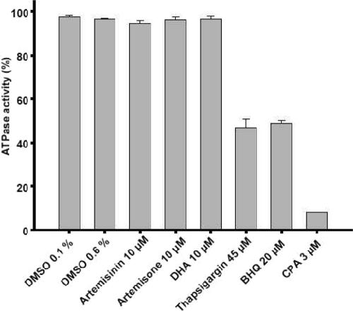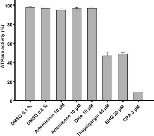 Purified E255L mutant SERCA1a and purified PfATP6 are sensitive to SERCA-type inhibitors but insensitive to artemisinins.