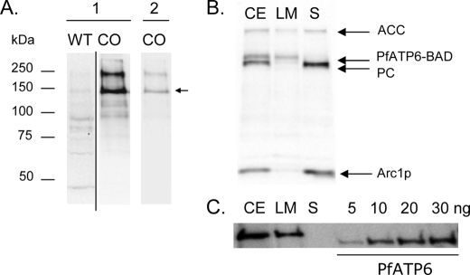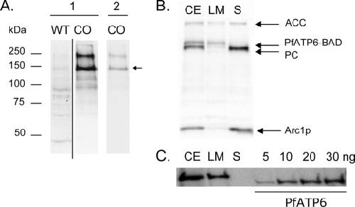 The antimalarial drugs artemisinins have been described as inhibiting Ca(2+)-ATPase activity of PfATP6 (Plasmodium falciparum ATP6) after expression in Xenopus oocytes. Mutation of an amino acid residue in mammalian SERCA1 (Glu(255)) to the equivalent one predicted in PfATP6 (Leu) was reported to induce sensitivity to artemisinin in the oocyte system. However, in the present experiments, we found that artemisinin did not inhibit mammalian SERCA1a E255L either when expressed in COS cells or after purification of the mutant expressed in Saccharomyces cerevisiae. Moreover, we found that PfATP6 after expression and purification from S. cerevisiae was insensitive to artemisinin and significantly less sensitive to thapsigargin and 2,5-di(tert-butyl)-1,4-benzohydroquinone than rabbit SERCA1 but retained higher sensitivity to cyclopiazonic acid, another type of SERCA1 inhibitor. Although mammalian SERCA and purified PfATP6 appear to have different pharmacological profiles, their insensitivity to artemisinins suggests that the mechanism of action of this class of drugs on the calcium metabolism in the intact cell is complex and cannot be ascribed to direct inhibition of PfATP6. Furthermore, the successful purification of PfATP6 affords the opportunity to develop new antimalarials by screening for inhibitors against PfATP6.