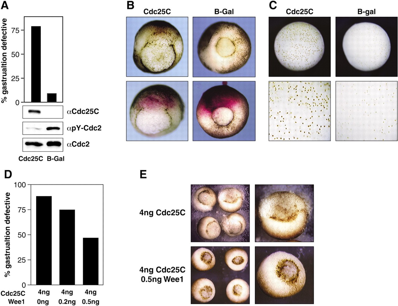 Fig. 7. Cdc25C overexpression disrupts gastrulation. (A,B) The two dorsal blastomeres of four-cell embryos were injected with β-gal RNA (4 ng) or co-injected with β-gal (100 pg) and His-Cdc25C (3 ng) and embryos were scored for gastrulation defects at stage 11.5-12. Number of embryos examined: Cdc25C (n=141), β-Gal (n=162). (A, lower panels) Stage 10.5-11 embryo lysates were examined by immunoblot analysis using anti-His-epitope, Cdc2 and phospho-Cdc2 antibodies. (C) Following injection as in A, mitotic nuclei of stage 11 embryos were visualized. Mitotic index (n=10-12 embryos): β-gal, 8.3% (6928 nuclei), Cdc25C, 28.1% (5550 nuclei). (D,E) Embryos were injected with 4 ng of Cdc25C RNA and either 0, 0.2 or 0.5 ng of Wee1 RNA. Number of embryos examined: Cdc25C + 0 ng Wee1 (n=74), Cdc25C + 0.2 ng Wee1 (n=100) and Cdc25C + 0.5 ng Wee1 (n=86). Note that increased expression of Wee1 counteracts the defects induced by Cdc25C overexpression.