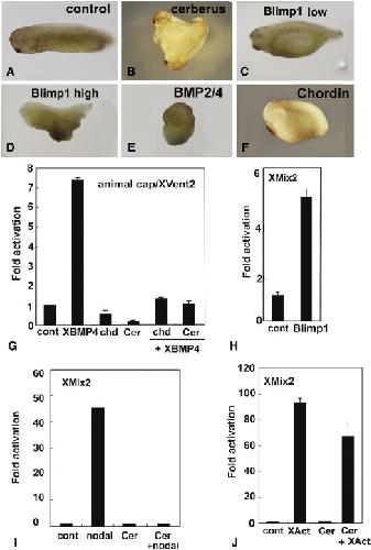Fig. 7. Experiments in Xenopus show conserved protein functions. (AâF) Injections into marginal zones of 4-cell Xenopus embryos except for B. (A) Uninjected control. (B) 10 pg/cell amphioxus Cerberus mRNA in D4 blastomere at 32 cell stage induces secondary axis. (C) 100 pg/cell amphioxus Blimp1 mRNA expands ventral structures. (D) 500 pg/cell amphioxus Blimp1 mRNA reduces head structures and expands ventral ones. (E) 100 pg/cell amphioxus BMP2/4 mRNA ventralizes. (F) 10 pg/cell amphioxus Chordin mRNA enlarges the cement gland. (GâJ) Assays of amphioxus proteins in Xenopus animal caps. (G) BMP responsive reporter assay. Amphioxus Chordin and Cerberus suppress signaling by Xenopus BMP4, as monitored by transcription from an Xvent2 reporter. (H) Amphioxus Blimp1 induces transcription from a Nodal-responsive (Xmix2) reporter construct. (I) Nodal-responsive assay. Amphioxus Cerberus suppresses amphioxus Nodal. (J) Activin response assay. Amphioxus Cerberus suppresses Xenopus Activin signaling. Experiments done twice with comparable results; error bars ± 1 s.d. |