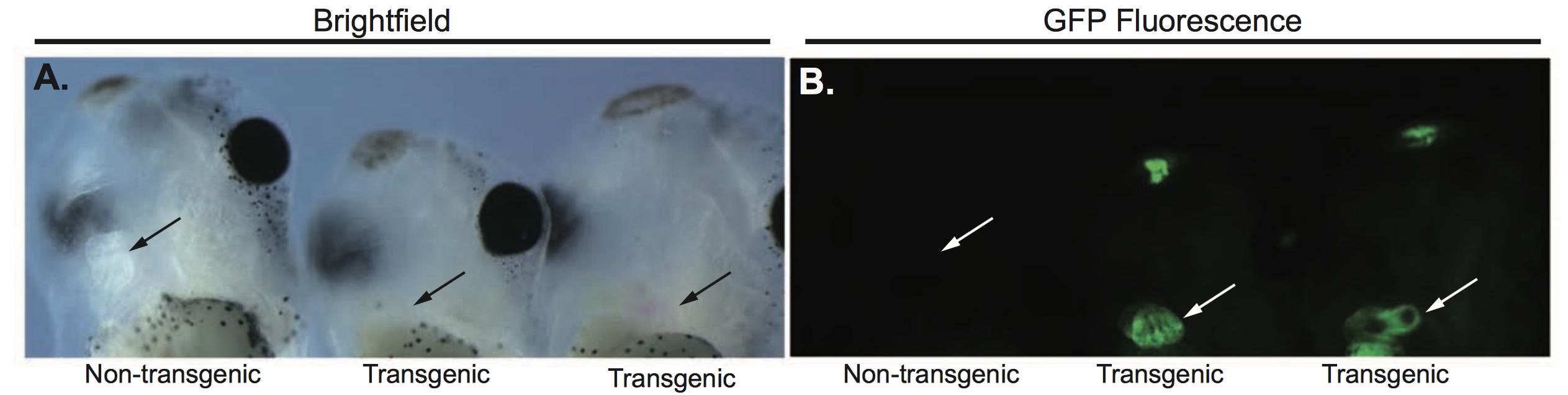 Fig. S1. The Tbx20-EGFP reporter directs EGFP expression reproducibly in the heart and cement gland of transgenic siblings. (A,B) Ventral view of the anterior end of stage 46 non-transgenic (left) and transgenic siblings (right) generated from one batch of injections of the Tbx20(-2464)-EGFP reporter demonstrate consistent and reproducible EGFP expression within the heart and cement gland of transgenic embryos. Brightfield views of living embryos (A) and corresponding EGFP fluorescence (B) are shown.