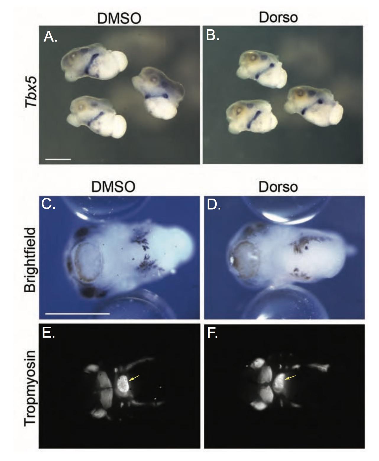Fig. S3. SMAD1 inhibition during cardiac chamber differentiation does not affect expression of the cardiac markers tropomyosin and Tbx5. (A,B) In situ hybridization for Tbx5 on stage 40 DMSO (A) and dorsomorphin-treated (B) anterior explants shows normal expression of Tbx5 in the heart and cardinal vein after SMAD1 inhibition. (C-F) Whole-mount antibody staining for tropomyosin of a stage 40 DMSO (C,E) or dorsomorphin-treated (D,F) anterior explants. Ventral view reveals no change in expression of tropomyosin in the heart after treatment with dorsomorphin. Dorso, dorsomorphin. Scale bars: 1 mm.