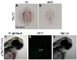 Fig. 8. The Xenopus Tbx20 334 bp cardiac regulatory element drives EGFP expression in a cardiac-specific manner in zebrafish. (A,B) In situ hybridization depicts expression of Tbx20 in wild-type zebrafish embryos and alk8sk42 (Marques and Yelon, 2009) mutant siblings at the 10-somite stage; dorsal views, anterior to the top. Tbx20 expression is reduced in both the anterior lateral plate mesoderm, including the bilateral cardiac primordia, and the midline mesenchyme of zygotic alk8 mutants. (C-E) Lateral views of a live zebrafish embryo at 48 hpf, following injection with the XTbx20(34)-EGFP transgene. Injected embryos express EGFP in the myocardium (arrows).