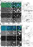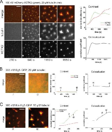 Figure 4. Self-organization of microtubules and mitotic kinesins. (A) Self-organization of microtubules and XCTK2: time course of the formation of microtubule asters in the presence of 100 nM mCherry-XCTK2 and 20 µM tubulin. (left) Epifluorescence images of mCherry-XCTK2 and Cy5-tubulin taken at the indicated times in the individual color channels and as merged images. (right) Time course of organization monitored by image parameters: total contrast (top) for mCherry-XCTK2 images (green) and Cy5-microtubule images (red) as calculated by the standard deviation from the mean; colocalization (bottom) of mCherry-XCTK2 and Cy5-microtubule signals as calculated by Pearson’s correlation. (B) Self-organization of microtubules and Eg5. (left) Early (t1) and late (t2) example images illustrating the development of self-organization with Eg5-GFP (green) and Cy5-microtubules at the concentrations indicated. (right) The time course of self-organization is monitored by the standard deviation, which is indicative of contrast (left), and Pearson’s correlation coefficient, which is indicative of colocalization (right), for the color channels as indicated. The time points of the example images to the left are indicated in the curves with arrows. (C) Self-organization of microtubules and chimeric Kin-Eg5. Composition of the figure is as described in B. All experiments were performed in assay buffer with 50 mM KCl. a.u., arbitrary unit. Bars, 50 µm.