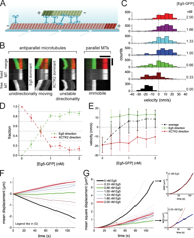 Figure 2. Competition of antagonistic motors in antiparallel microtubule sliding. (A) Scheme of a pair of polarity-marked microtubules in a sliding assay (symbols as in Fig. 1 A). (B) Different motility states of microtubule pairs. Example kymographs of a freely movable Alexa Fluor 568–microtubule (MT; green) bound via motor cross-links to a surface-immobilized Cy5-microtubule (red) in the presence of 0.5 nM XCTK2 and 0.66 nM Eg5-GFP, illustrating Eg5-dominated unidirectional antiparallel sliding, XCTK2-dominated unidirectional antiparallel sliding, movement with unstable directionality, and static parallel binding (from left to right). All kymographs are taken from the same sample. (C) Histograms of the instantaneous velocities of antiparallel sliding microtubules during the competition between 0.5 nM XCTK2 and varying concentrations of Eg5 (indicated to the right). Histograms contain all data of three independent experiments. (D) Fractions of Eg5-GFP– and XCTK2-dominated movement during microtubule sliding, calculated as described in Materials and methods. (E) Mean velocities of all microtubule movements and mean velocities separately determined for only the XCTK2-dominated microtubule movements and for the Eg5-GFP–dominated movements compiled from C. (F) Mean displacement curves of antiparallel sliding microtubules during the competition. Color code as in C and G. The highest, the lowest, and the balance point Eg5 concentrations are emphasized by thick lines. (G, left) MSD curves of antiparallel sliding microtubules. (top right) MSD curve of antiparallel sliding microtubules in the presence of 0.5 nM XCTK2 (black) fitted with a parabolic function (red). (bottom right) MSD curve of antiparallel sliding microtubules in the presence of 0.5 nM XCTK2 and 0.66 nM Eg5-GFP (black) fitted with a parabolic function (from 0 to 36 s; red) and a linear function (from 36 s onward; blue). The dashed lines show continuations of the fit equation in the data range that was not used for the fit. Error bars in D and E are standard errors of the mean. Dotted lines in F and G are 95% confidence intervals. All experiments shown were performed in assay buffer containing 50 mM KCl. Bars: (B, horizontal) 5 µm; (B, vertical) 120 s.