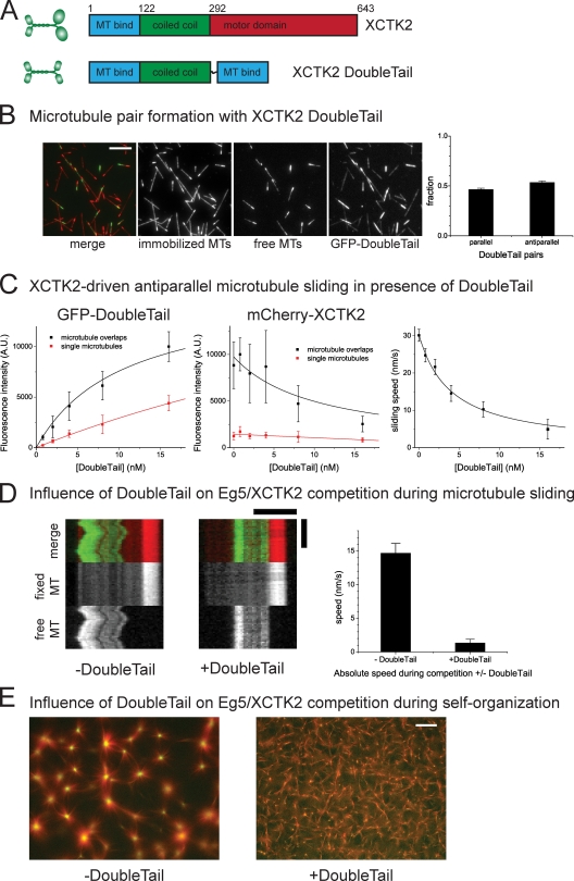 Figure 6. Effect of a nonmotor microtubule cross-linking protein on microtubule sliding and self-organization. (A) Schematic representations of XCTK2 and the DoubleTail construct. Numbers indicate amino acid position of the XCTK2 coding sequence. (B) GFP-DoubleTail cross-links microtubules (MTs). (left) Merged microtubule channels and individual color channels of microtubule pairs formed with 0.8 nM XCTK2 GFP-DoubleTail. (right) Fraction of microtubule pairs with parallel and antiparallel orientation. (C) Addition of XCTK2 GFP-DoubleTail to an antiparallel microtubule sliding assay with 1 nM mCherry-XCTK2 motor. (left) Binding of GFP-DoubleTail to single microtubules and to microtubule overlaps. (middle) GFP-DoubleTail competes with mCherry-XCTK2 for binding to microtubules. Black lines are global fits to the DoubleTail binding and competitive inhibition curves for microtubule overlaps with the shared fit parameter Kd for the DoubleTail binding to microtubule pairs, yielding a Kd of 10.4 ± 3.0 nM (error is standard error of the mean). (right) Increasing concentrations of GFP-DoubleTail decreases the sliding velocity. The black line is a fit assuming protein friction exerted by DoubleTail (see Materials and methods). A.U., arbitrary unit. (D, left) Typical kymographs of microtubule pairs in a motor competition experiment with 0.66 nM Eg5 and 0.5 nM XCTK2 in the absence or presence of 16 nM GFP-DoubleTail. (right) Quantification of the mean absolute sliding velocity of antiparallel microtubules under these conditions. (E) Self-organization of microtubules and antagonistic kinesins (100 nM mCherry-XCTK2 and 66 nM Eg5-GFP) in the absence or presence of 1 µM Z-GFP-DoubleTail. Merged images of microtubules (red) and mCherry-XCTK2 (green) after 36 min. Entire recorded time course is shown in Video 10. Error bars are standard errors of the mean (B, C [right], and D) or standard deviations (C, left and middle). Bars: (B) 10 µm; (D, horizontal) 5 µm; (D, vertical) 120 s; (E) 50 µm.