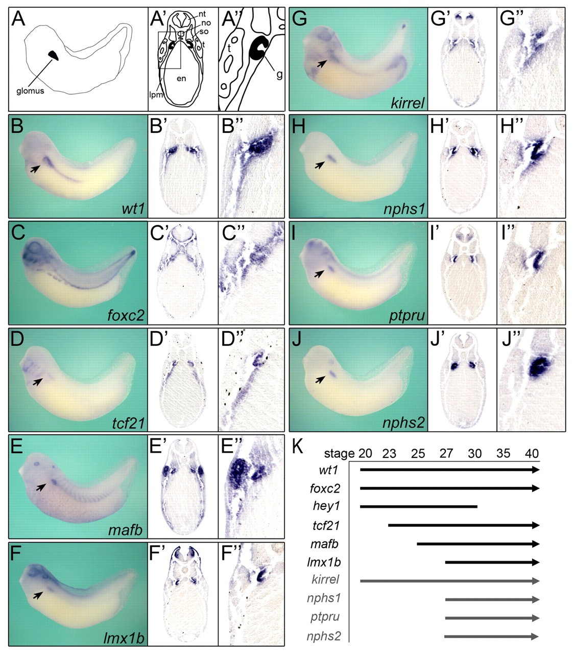Fig. 1. Spatiotemporal expression of podocyte genes. (A-Aâ²) Schematics depicting the glomus (black) in whole Xenopus embryos (A) and in transverse section at low (Aâ²) and high (Aâ²) magnification at stage 35. (B-Jâ²) In situ hybridization of podocyte transcription factors wt1 (B-Bâ²), foxc2 (C-Câ²), tcf21 (D-Dâ²), mafb (E-Eâ²) and lmx1b (F-Fâ²) and of markers of podocyte differentiation kirrel (G-Gâ²), nphs1 (H-Hâ²), ptpru (I-Iâ²) and nphs2 (J-Jâ²) at stage 35 in whole-mounts (B-J) and transverse sections (Bâ²-Jâ²). (K) Temporal profile of podocyte gene expression in the glomus. en, endoderm; g, pronephric glomus; lpm, lateral plate mesoderm; no, notochord; nt, neural tube; so, somites; t, pronephric tubules.