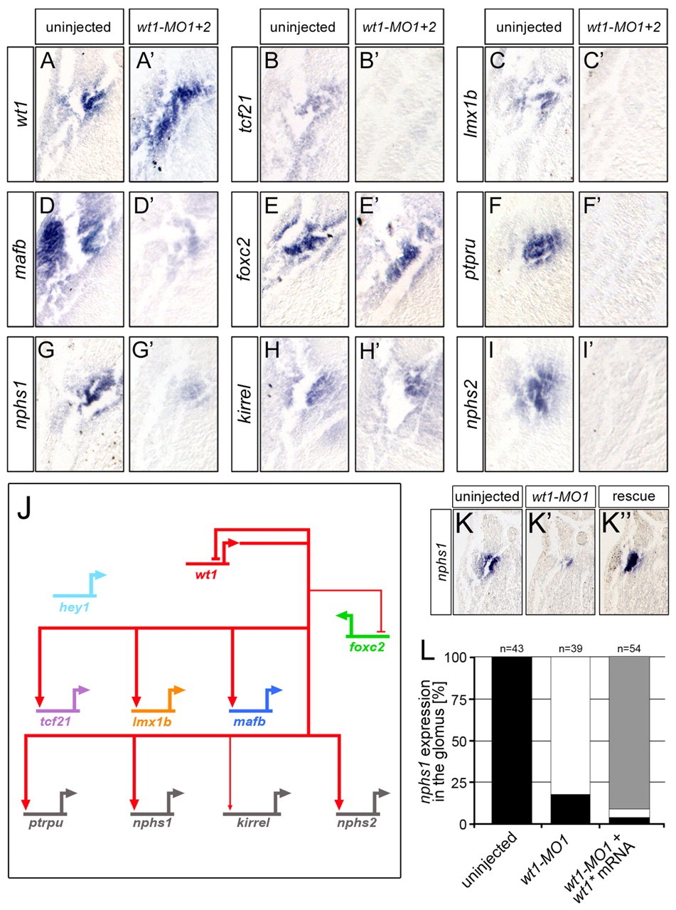 Fig. 3. wt1 regulates podocyte gene expression. (A-Iâ²) High magnification of representative transverse sections of whole-mount in situ hybridizations comparing the expression of podocyte genes wt1 (A,Aâ²), tcf21 (B,Bâ²), lmx1b (C,Câ²), mafb (D,Dâ²), foxc2 (E,Eâ²), ptpru (F,Fâ²), nphs1 (G,Gâ²), kirrel (H,Hâ²) and nphs2 (I,Iâ²) between wt1 morphants and sibling control Xenopus embryos at stage 35. (J) Wire diagram summarizing the in situ hybridization data. Arrows, positive regulation; T-bars, negative regulation; thick lines, strong effects; thin lines, weak effects. Note that none of the interactions is necessarily direct and might involve intermediary players. (K-L) In situ hybridization of nphs1 in uninjected controls (K), embryos injected with wt1-MO1 (Kâ²) and with wt1* mRNA and wt1-MO1 (Kâ²). The results of multiple experiments were quantified (L). Black, strong bilateral expression; white, loss of expression; gray, unilateral expression rescued by wt1* mRNA.