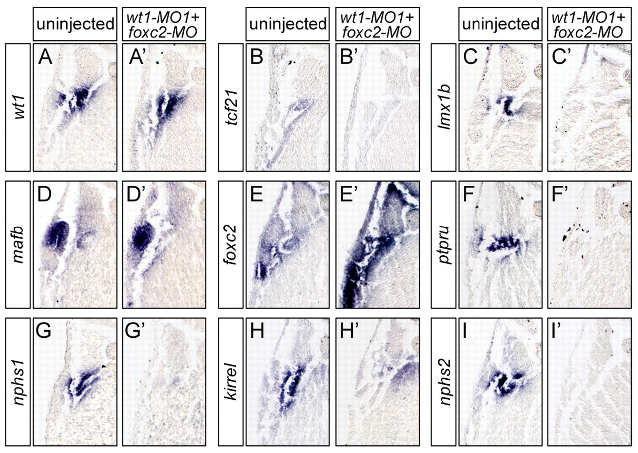 Fig. 5. wt1 and foxc2 are required together for expression of podocyte genes. (A-Iâ²) High magnification of transverse sections of whole-mount in situ hybridizations comparing the expression of podocyte genes wt1 (A,Aâ²), tcf21 (B,Bâ²), lmx1b (C,Câ²), mafb (D,Dâ²), foxc2 (E,Eâ²), ptpru (F,Fâ²), nphs1 (G,Gâ²), kirrel (H,Hâ²) and nphs2 (I,Iâ²) between wt1-MO1 plus foxc2-MO co-injected Xenopus embryos (Aâ²-Iâ²) and sibling controls (A-I) at stage 35.