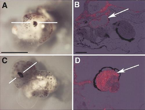 Fig. 3. The eye induced in vitro was derived from animal cap cells. (A,B) Lineage labeling in dorsal lip cells. Explant, external view (A) and histologic section (B). TRDA signal (red fluores- cence) was observed in the notochord only (B, white arrow). (C,D) Lineage labeling in animal cap cells. Explant, external view (C) and histologic section (D). TRDA signal was observed in the eye only (D, white arrow), indi- cating that the eye formed in vitro was derived from animal cap cells. The white line in A and B indicate the approximate position of the section. Scale bar indicates 1 mm (A) or 10 μm (B). |