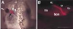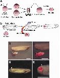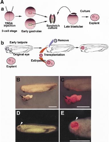 Fig. 4. The eye formed in vitro was transplanted into stage33 tadpoles. (A) Schematic dia- grams of lineage labeling (a) and transplantation (b). The 2-cell stage embryos were injected with 8 nL of 0.5% Texas red-dextran- amine (TRDA) at the animal pole. Using these embryos, the eye was induced and cultured until early tadpole stage (stage 33) (a). The left eye was surgically removed from the recipient tadpole (stage 33), and the eye formed in vitro was extirpated from the explant and transplanted into the tadpole (b). (B) External views of the recipient stage 33 tadpole (top) and the donor explant (bottom). Black arrow indicates eye induced in vitro. (C) Magnified view of B. TRDA signal (red fluorescence) was observed in the explant only. (D,E) Tadpole showing the trans- planted in vitro eye. (D) The graft was inserted at the position of the original eye. (E) Red fluorescence could be observed at the grafted eye. White arrowhead indicates the grafted eye. Scale bar indi- cates 1 mm (B,C,E). |